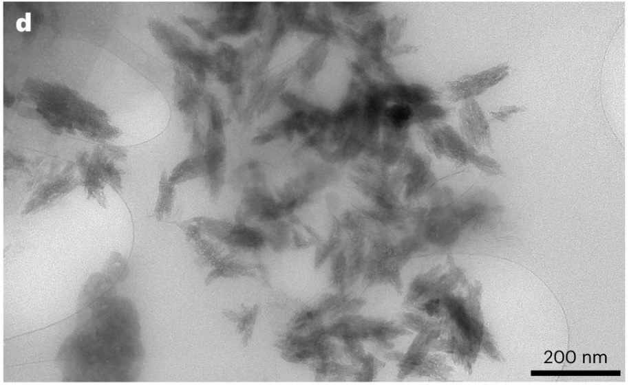 "We examined resuspended brain pellets by TEM, which revealed largely 100–200nm long shards or flakes" [2]